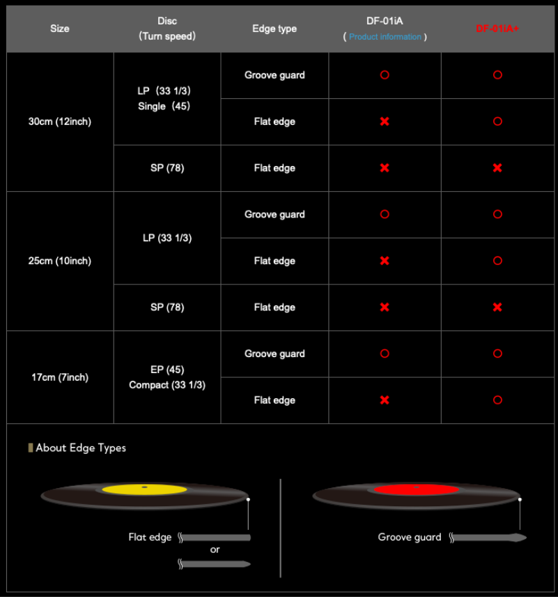 - DF-01iA – designed only for records with a groove-guard edge, i.e. most modern LPs.